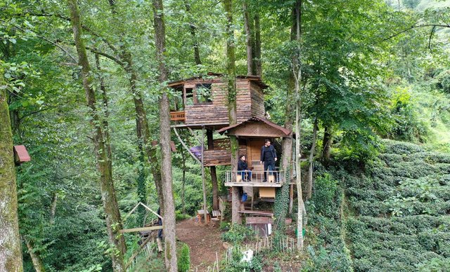 Rize'de yaşayan Murat Aksoy, babası ve kardeşinin yardımıyla kızılağaçların gövdeleri arasına yaptığı ahşap evlerde yakınlarını misafir ediyor