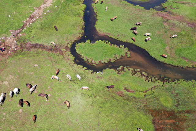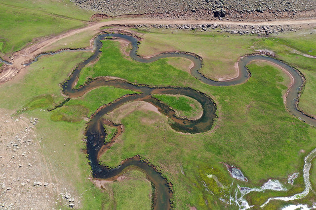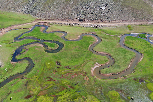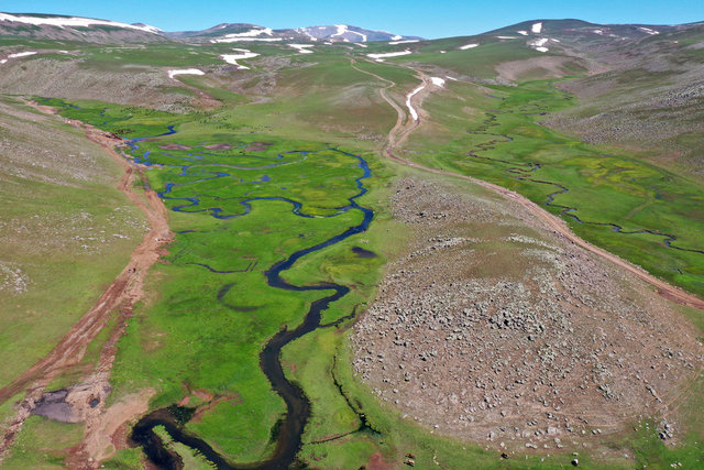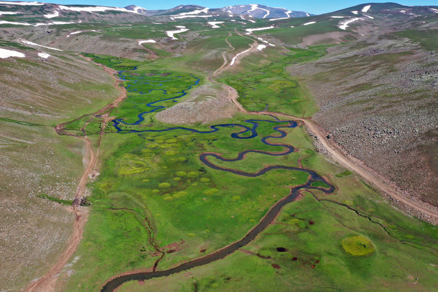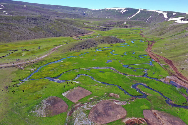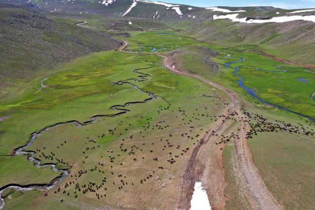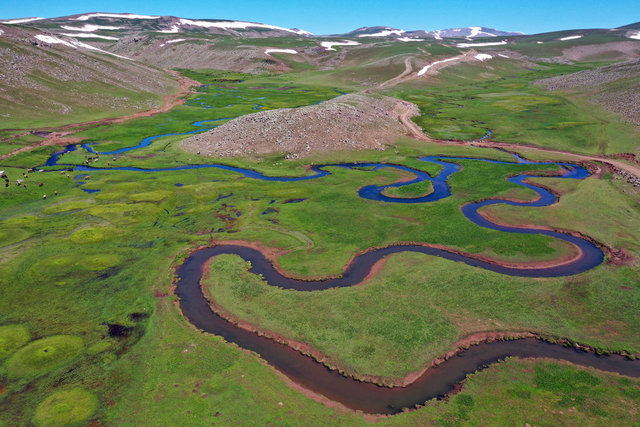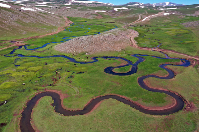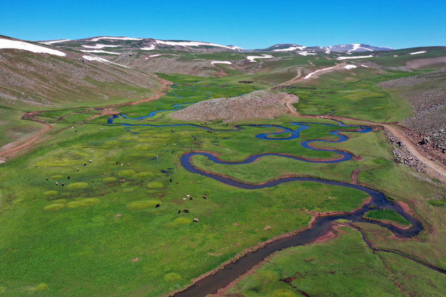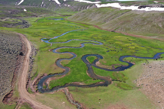Yüksek noktaları karla kaplı olan ve yeşilin farklı tonlarına bürünen zengin bitki örtüsünde otlayan hayvanlar ve menderesler AA tarafından dron ile görüntülendi.