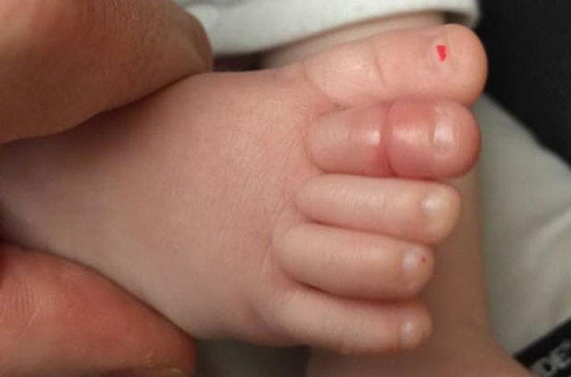 Walker, "Eşim Jess, bebeğimizin rahatlaması için çoraplarını çıkardı. O sırada bebeğimizin ayak parmağını gördük. Buna 'saç iplik turnike sendromu' deniyormuş.