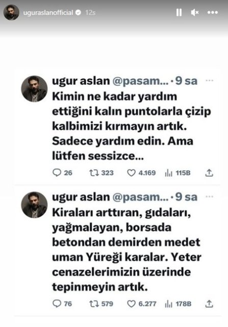 Uğur Aslan paylaşımında şu ifadelere yer verdi: "Kimin ne kadar yardım ettiğini kalın puntolarla çizip kalbimizi kırmayın artık. Sadece yardım edin. Ama lütfen sessizce... Kiraları arttıran, gıdaları yağmalayan, borsada betondan demirden medet uman yüreği karalar. Yeter cenazelerimizin üzerinde tepinmeyin artık."