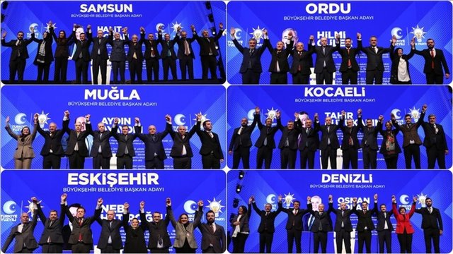 Buna göre; Aydın Büyükşehir Belediye Başkan adayı Mustafa Savaş, Balıkesir Büyükşehir Belediye Başkan adayı Yücel Yılmaz, Bursa Büyükşehir Belediye Başkan adayı Alinur Aktaş, Denizli Büyükşehir Belediye Başkan adayı Osman Zolan, Erzurum Büyükşehir Belediye Başkan adayı Mehmet Sekmen, Eskişehir Büyükşehir Belediye Başkan adayı Nebi Hatipoğlu, Kocaeli Büyükşehir Belediye Başkan adayı Tahir Büyükakın, Muğla Büyükşehir Belediye Başkan adayı Aydın Ayaydın, Ordu Büyükşehir Belediye Başkan adayı Mehmet Hilmi Güler ve Samsun Büyükşehir Belediye Başkan adayı Halit Doğan oldu.