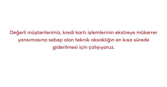 Bankamız kredi kartı işlemlerine yansıyan aksaklık giderilmiştir. Bu durumdan etkilenen müşterilerimizin kredi kartlarının limit sorunu çözülmüştür. Mükerrer kayıtlar düzeltilmektedir.