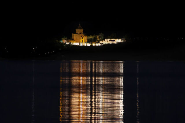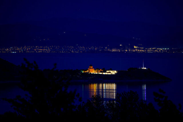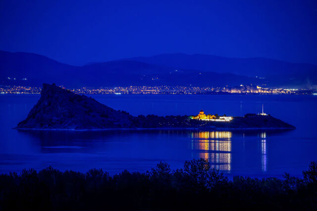 Kenti bir çok yerli ve yabancı turistin ziyaret etmesine vesile olan tarihi ada ve kale, havanın kararmasının ardından yanan ışıkları ile Van Gölü'nü süslüyor.