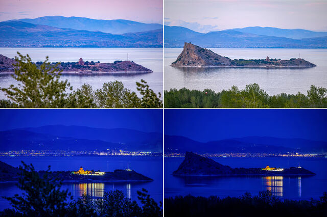 Görüntülerde Akdamar Adası ile arka fonunda yer alan kent merkezi ve Van Kalesinin aynı noktadan hem gündüz hem de akşam görünümü yer alıyor.