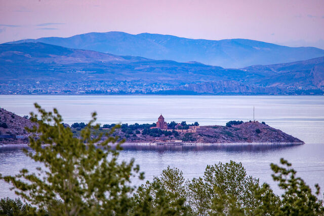 Van'ın Gevaş ilçesi sınırlarında yer alan Akdamar Adası ile İpekyolu ilçesindeki Van Kalesi aynı kadrajda kaydedildi.