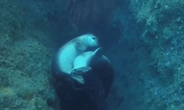 Antalya'da, Sualtı Federasyonu İl Temsilcisi İsa Alemdar ve Erkun Tanyar'ın birlikte yaptığı falezler dalışı sırasında, bir çift Akdeniz fokunun 'aşk dansı' kamera görüntülerine yansıdı.