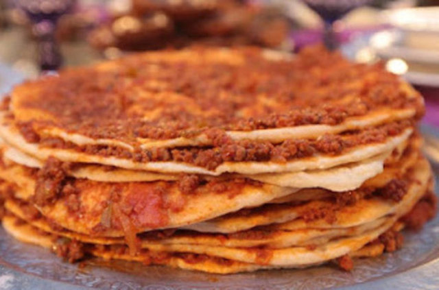 Kıymayı sıvıyağ ile kavurun. Tuz ve karabiberinin katın. İnce ince doğradığınız soğanları ekleyip kavurun. Ardından sivri biberleri katarak kısık ateşte kavurma işlemine devam edin. Salçaları ekleyin. En son da minik mink doğradığınız domatesleri ekleyin. 10 dakika daha kavurun. Tencerenin kapağını kapatın. Bir kenara alın. Mayalanan hamurdan mandalina büyüklüğünde bezeler yapın. En son üzerinin bir bezle örtün. Teker teker bezeleri açın. Açtığınız bezeleri yanmaz tavada önlü arkalı pişirin. Lavaşların pişmesi bittikten sonra her araya kıymalı sostan sürerek, üst üste dizin. Kıymalı harç bittiğinde işlem tamam demektir. Servis ederken üzerine yoğurtlu sarımsak sostan gezdirin. İnce kıyılmış maydanozla da süsleyin.