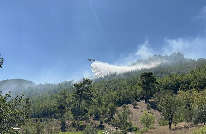 6 uçak, 1'i yönetim olmak üzere 4 helikopter, 13 arazöz, 4 su ikmal aracı, 2 ilk müdahale aracı ve 2 dozer ile çok sayıda personelin müdahale ettiği yangın bölgesinde çalışmaların devam ettiği belirtildi.