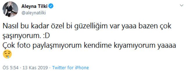 "Kendime kıyamıyorum" diyen Tilki, yaptığı paylaşımda "Nasıl bu kadar özel bir güzelliğim var ya? Bazen çok şaşırıyorum. Çok fotoğraf paylaşmıyorum. Kendime kıyamıyorum ya" ifadelerini kullandı.