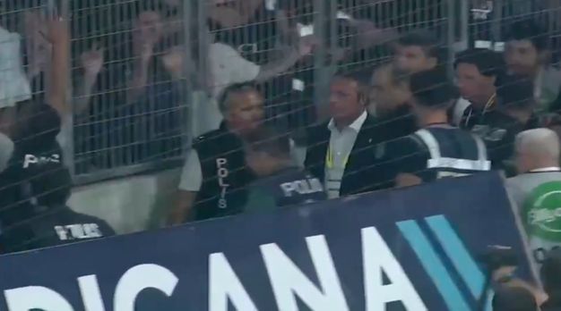 Deplasman tribününe giremeyen taraftarlar olduğu için o bölüme giden ve desteğini gösteren Fenerbahçe Başkanı Ali Koç'a protokole dönüşte saha kenarında yabancı madde yağdı.