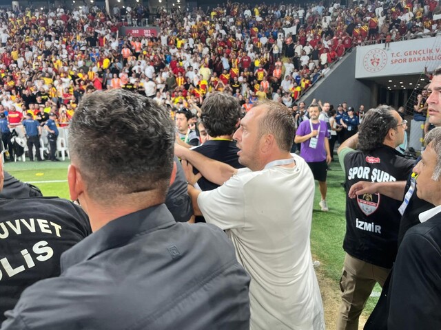 Bunun üzerine İzmir İl Emniyet Müdürlüğü Spor Güvenliği Şubesi ekipleri, Koç'u saha kenarında yürüdüğü sırada iterek düşüren Fatih Özkan'ı gözaltına aldı.