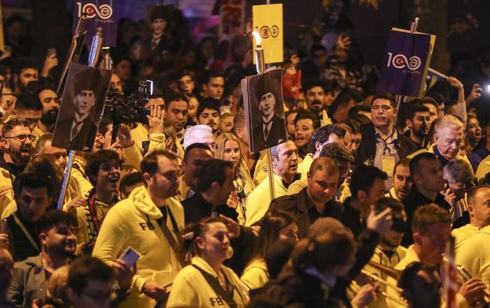 Türk bayrağı sallayıp, taraftarlara "sarı-lacivert" sloganıyla üçlü çektiren Ali Koç, "Yaşasın laik Türkiye Cumhuriyeti. Bu kalabalık gösteriyor ki Türkiye'nin 100. yılında şampiyonluklar en çok da bize yakışacaktır." ifadelerini kullandı.