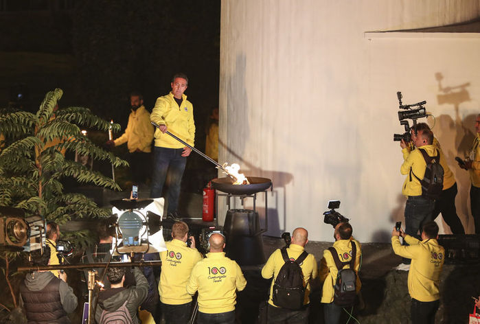 Alanda bulunan meşaleyi yakan Ali Koç, yöneticiler ve sporcular, daha sonra çalınan marşlara eşlik etti.