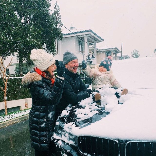 Mutlu evlilikleri süren çiftten Kurbanzade, İstanbul'un beyaza bürünmesinin ardından eşi ve kızı ile birlikte soluğu dışarıda aldı.