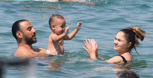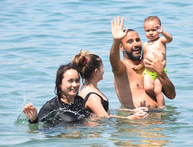 Bodrum Gölköy'deki bir plajda görüntülenen Alişan, oğlu ile denize girdi.