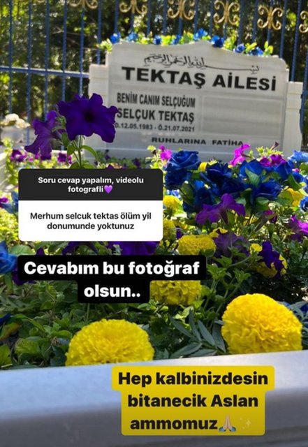 Bir takipçisinin konuyla alakalı sorusunu yanıtlayan oyuncu, Selçuk Tektaş'ın mezarının fotoğrafını paylaşarak, "Cevabım bu fotoğraf olsun" dedi.