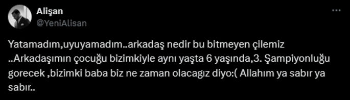 Alişan, daha sonra da; "Yatamadım, uyuyamadım... Arkadaş nedir bu bitmeyen çilemiz. Arkadaşımın çocuğu bizimkiyle aynı yaşta, 6 yaşında... 3'üncü şampiyonluğu görecek. Bizimki, 'baba biz ne zaman olacağız' diyor. Allah'ım ya sabır ya sabır..." dedi.
