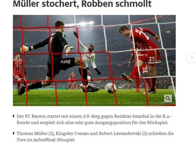 Süddeutsche Zeitung ise, "Müller vuruyor, Robben somurtuyor" başlıklı haberinde Robben'in ilk 11'de başlamadığı için üzgün olduğuna vurgu yaparak, "Bayern Münih, Beşiktaş karşısında 5-0 galip gelerek ikinci maç için çok büyük avantaj sağladı. Müller, takımına iki gol ile katkı sağlarken, Robben ilk onbirde başlamadığı için üzgündü" ifadelerine yer verdi.