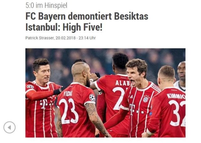 Kicker Dergisi, "Bayern Münih açık farkla çeyrek finale" başlığını kullandığı haberde, "Bayern, UEFA Şampiyonlar Ligi son 16 turu ilk maçında Beşiktaş karşısında 5-0 kazanarak çeyrek final kapısını açtı. Türkiye şampiyonu sadece oyunu kaybetmekle kalmadı, aynı zamanda Vida'yı da kaybetti" ifadelerini kullandı.