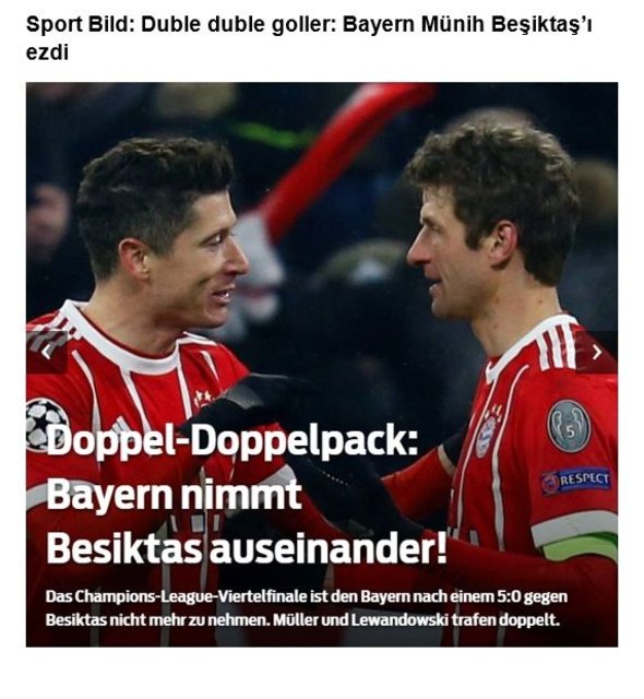 Haberde ayrıca, "İlk maçında Beşiktaş'ı 5-0'lık ezici skorla yenen Bayern Münih, çok rahat bir şekilde İstanbul'a gidecek" denildi.