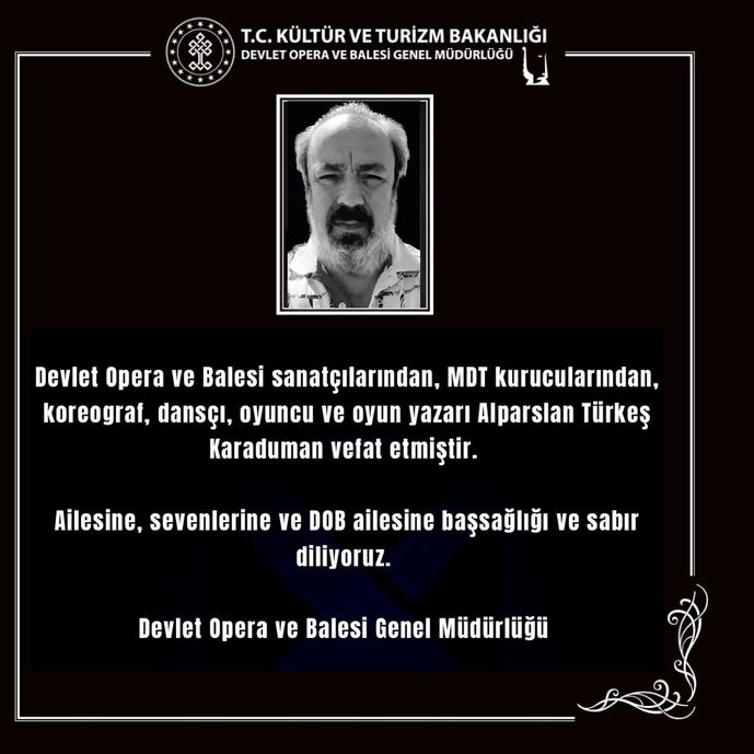 Devlet Opera ve Balesi sanatçılarından, koreograf, dansçı, oyuncu ve oyun yazarı Alparslan Türkeş Karaduman, vefat etti