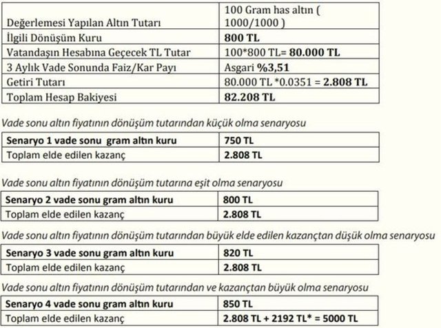 Cevap: Vatandaşın fiziki altınını rafinerilerin kuyumcu ağları veya bankaya teslim edip Altın dönüşümlü TL mevduat ve katılım mevduat hesabı açtırmaları halindeki senaryo örnekleri: