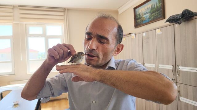 Amasya'da bitkin düşen serçe yavrusuna okul müdürü yardım etti