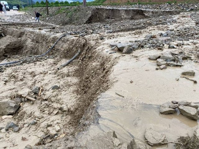 Karayolları ve DSİ ekiplerinin, suyu tahliye etme, yoldaki taş ve diğer malzemeleri temizleme çalışmaları devam ediyor.