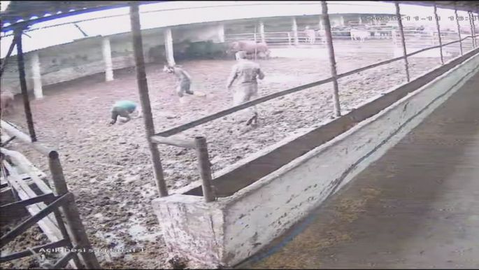 Amasya'nın Suluova ilçesindeki çiftlikte büyükbaşlarını bir araya toplamak isteyen besici, boğanın saldırısına uğradı. Boğanın boynuzuyla vurduğu besicinin yere düştüğü anlar, çiftliğin güvenlik kamerasına yansıdı. Besici aldığı darbeyle bir süre yerden kalkamadı
