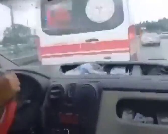 Bir sürücü, trafiğe yakalanmamak için sol şeritte ilerleyen ambulansın peşine takıldı. Bu sırada araçtaki bir kişi de o anları cep telefonu kamerasıyla görüntülüyordu.