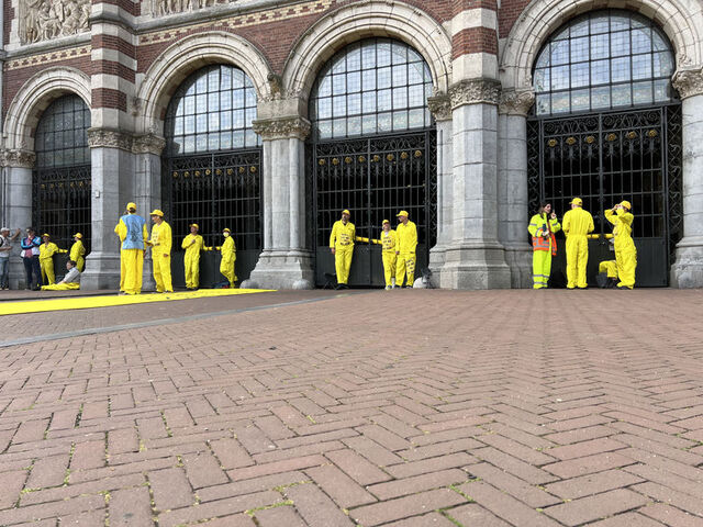 Sarı tulumlar giyen yaklaşık 60 gösterici, Rijksmuseum'dan sponsoru olan bankayla ilişkisini kesmesini istiyor.