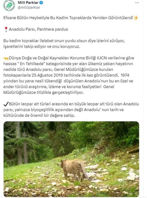 Doğa Koruma ve Milli Parklar Genel Müdürlüğü´nün Twitter'daki hesabından yapılan açıklamada, nesli tehlike altında olan ve 1974´ten sonra Türkiye´de ilk kez 25 Ağustos 2019'da fotokapan görüntülerine yansıyan Anadolu leoparının yeniden görüntülendiği belirtildi.