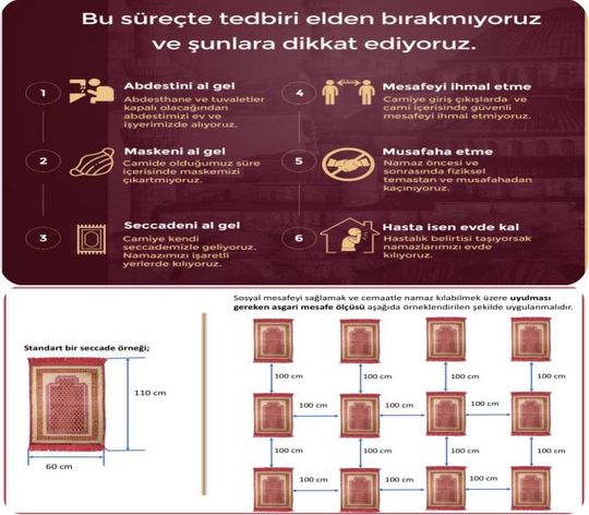 2- Öğle ve ikindi namazları tüm camilerimizde sosyal mesafe kuralına uyularak cemaatle birlikte kılınacaktır. Diğer vakitlerde münferiden namaz kılmak isteyenler için camiler açık tutulacaktır.