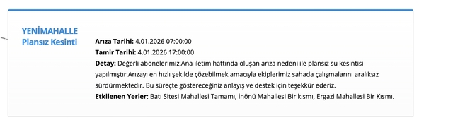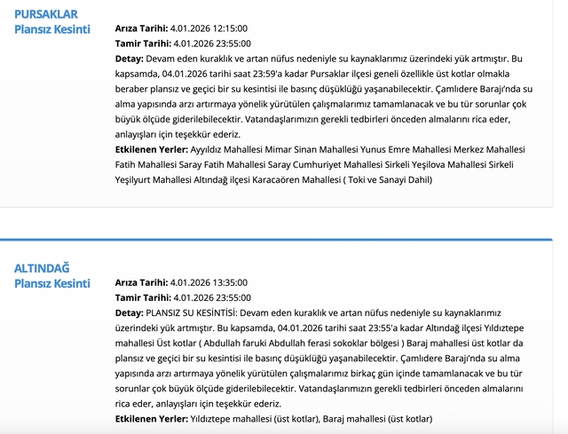 Ankara'da ASKİ su kesintisi güncel olarak duyuruldu. ASKİ su kesintisi sorgulama işlemi resmi web sitesi üzerinden yapılabiliyor ve güncel duyurulara göre bugün (4 Ocak 2026) çeşitli bölgelerde planlı kesintiler devam ediyor. Peki Ankara'da sular ne zaman, saat kaçta gelecek?