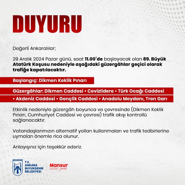 Ankara Büyükşehir Belediyesi (ABB) tarafından yapılan açıklamada, "Değerli Ankaralılar; 29 Aralık 2024 Pazar günü, saat 11.00'de başlayacak olan 89. Büyük Atatürk Koşusu nedeniyle aşağıdaki güzergâhlar geçici olarak trafiğe kapatılacaktır. Başlangıç; Dikmen Keklik Pınarı. Güzergâhlar; Dikmen Caddesi, Cevizlidere, Türk Ocağı Caddesi, Akdeniz Caddesi, Gençlik Caddesi, Anadolu Meydanı, Tren Garı. Etkinlik nedeniyle güzergâh boyunca ve çevresinde (Dikmen Keklik Pınarı, Cumhuriyet Caddesi ve çevresi) trafik akışı kontrollü sağlanacaktır. Vatandaşlarımızın alternatif yolları kullanmaları ve trafik tedbirlerine uymaları önemle rica olunur. Anlayışınız için teşekkür ederiz" denildi.