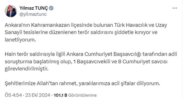 Adalet Bakanı Yılmaz Tunç, resmi X hesabından açıklama yaptı. Bakan Tunç, "Ankara'nın Kahramankazan ilçesinde bulunan Türk Havacılık ve Uzay Sanayii tesislerine düzenlenen terör saldırısını şiddetle kınıyor ve lanetliyorum. Hain terör saldırısıyla ilgili Ankara Cumhuriyet Başsavcılığı tarafından adli soruşturma başlatılmış olup, 1 Başsavcıvekili ve 8 Cumhuriyet savcısı görevlendirilmiştir. Şehitlerimize Allah’tan rahmet, yaralılarımıza acil şifalar diliyorum" dedi.