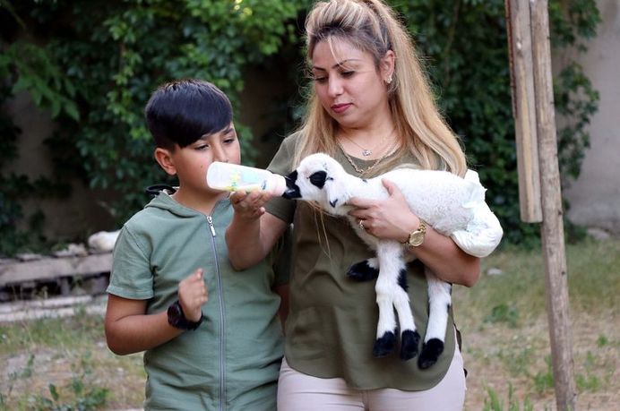 Yeni tip koronavirüs (Kovid-19) ile mücadele sürecinde evlerine neşe katan Boncuk'a özenle bakan anne ve oğlu kuzuyu bezliyor, biberonla besliyor.