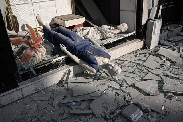 Fotoğraflarda, enkazın önünde üzerindeki gelinlikle duran cansız manken de görülüyor.