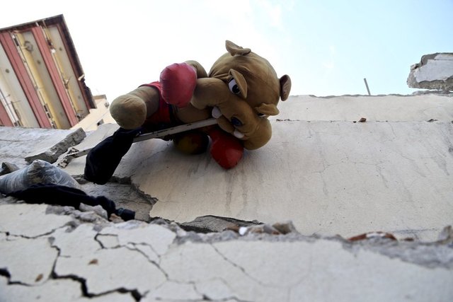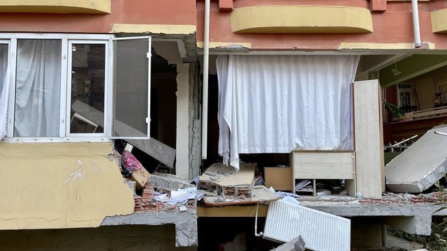 Kent merkezinde arama kurtarma çalışması yapılan bir apartmanın enkazında asılı kalan pelüş oyuncak ve duvarları yıkılan evlerdeki asılı perdeler dikkati çekiyor.