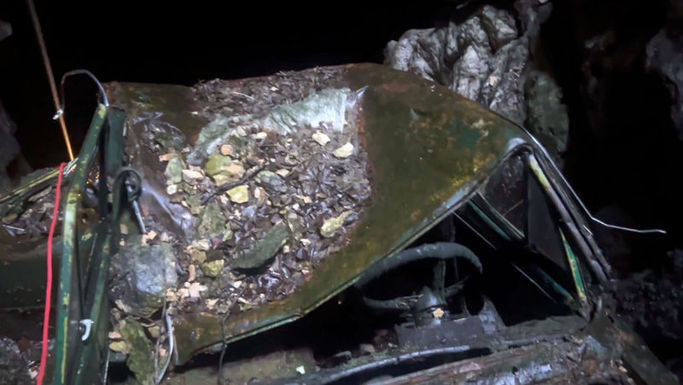 Metal sesi duyan ikili hazırlanarak mağaraya iniş yaptı. Mağaraya inip kafa lambalarını yakan ikili, bir hurda otomobil ile karşılaştı.