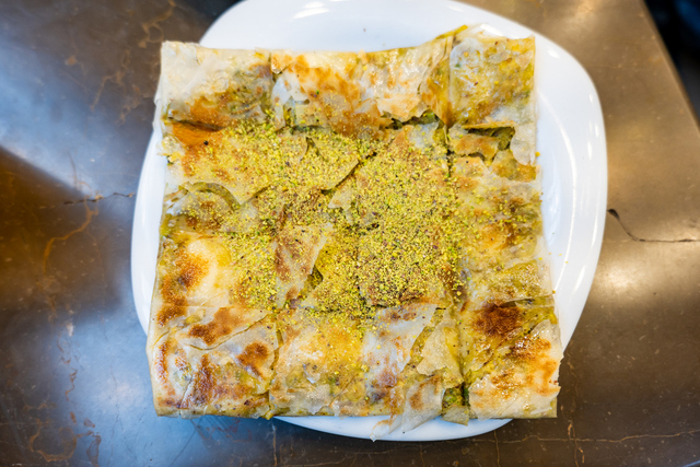 Açılan hamurun üzerine eritilmiş tereyağı gezdirin. Ardından toz şeker ve bolca Antep fıstığını eşit şekilde serpin. İsteğe bağlı olarak kaymak da ekleyebilirsiniz. Hamuru kenarlardan içe doğru katlayarak kare veya dikdörtgen form verin. Bu katlama işlemi katmerin çıtır dokusunu oluşturur.