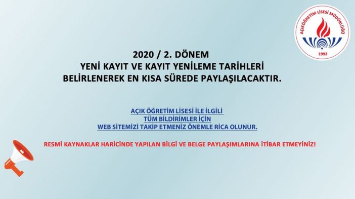 MEB tarafından yapılan açıklamada, ‘2020 / 2. dönem yeni kayıt ve kayıt yenileme tarihleri belirlenerek en kısa sürede paylaşılacaktır. Açık Öğretim Lisesi ile ilgili tüm bildirimler için web sitemizi takip etmeniz önemle rica olunur. Resmi kaynaklar haricinde yapılan bilgi ve belge paylaşımlarına itibar etmeyiniz!’ denildi. Henüz tarihler belli olmadı.