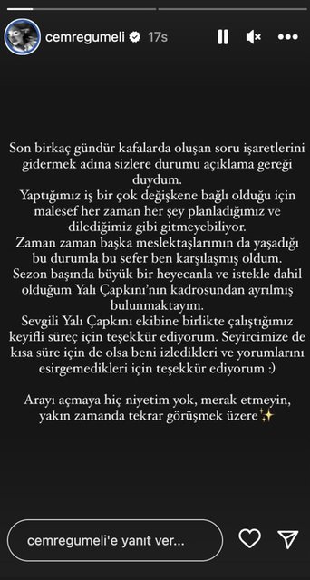 Sezon başında büyük bir heyecanla ve istekle dahil olduğum Yalı Çapkını'nın kadrosundan ayrılmış bulunmaktayım. Sevgili Yalı Çapkını ekibine birlikte çalıştığımız keyifli süreç için teşekkür ediyorum. Seyircimize de kısa süre için de olsa beni izledikleri ve yorumlarını esirgemedikleri için teşekkür ediyorum. Arayı açmaya hiç niyetim yok, merak etmeyin. Yakın zamanda tekrar görüşmek üzere!”