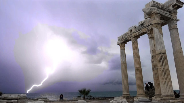 Antalya'da önceki günlerde sağanak etkili olurken, Manavgat'ın Side Mahallesi'ndeki 1800 yıllık Apollon Tapınağı'nda, deniz üzerinde şimşeklerin çakmasıyla eşsiz bir manzara oluştu. Turistler, fotoğraf çekerek bu manzarayı ölümsüzleştirdi