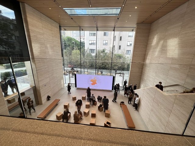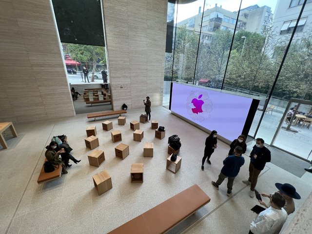İçeride, ziyaretçileri video duvarı ve Today at Apple atölye çalışmalarına ev sahipliği yapan Forum alanı karşılıyor.