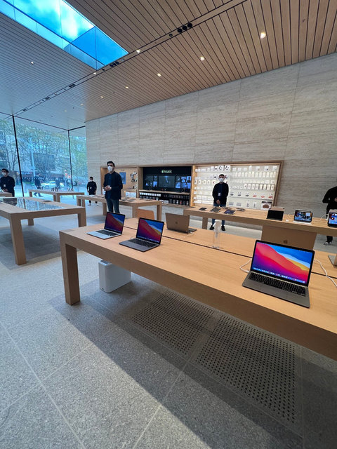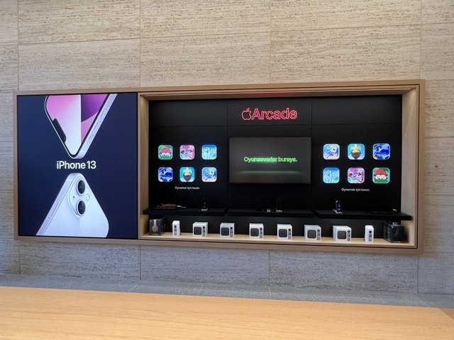 Üst katta ise müşterileri, Apple’ın en yeni ürün ve servislerini yakından inceleyebilecekleri bir alan bekliyor. Mekanın tamamı 9 metrelik cam giydirme ön cepheden dışarıyı görüyor.