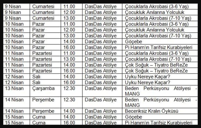 DasDas, çocuklara yönelik etkinlikleri bir araya getirdiği ‘Çocuk Günleri’ ile miniklere zengin bir hafta sunuyor. Sevilen tiyatro oyunlarıyla beraber, eğitici atölyelerin de yer alacağı ‘Çocuk Günleri’, 9-15 Nisan tarihleri arasında. Çocuk Günleri 9 Nisan günü 11.00’de 3-6 yaşa yönelik ‘Çocuklarla Akrobasi’ atölyesiyle başlıyor. Balkan ülkelerindeki toplulukların ve sanatçıların oluşturduğu Cirbobalkana Festivali’nin artistik direktörlerinden Milan Manic ve kurucularından Vladsana Manic’in düzenlediği atölyede çocuklar ve aileler ile temel akrobasi hareketleri çalışılacak. Arkaya ve öne taklalar, yıldız, yana dönüşler, top çevirme, ip ve trapez çalışmalarının yer alacağı 3-6 yaş atölyesi aynı zamanda 10 ve 11 Nisan günleri 11.00’de de gerçekleşecek. Aynı ekibin düzenlediği ve temel akrobasi hareketlerinin yanı sıra akrobalans ve piramit çalışmalarının da yer alacağı 7-10 yaşa yönelik atölyeler ise 9, 10 ve 11 Nisan günleri 13.00’de düzenlenecek. Program takvimini yukarıda bulabilirsiniz.