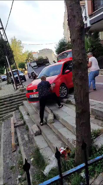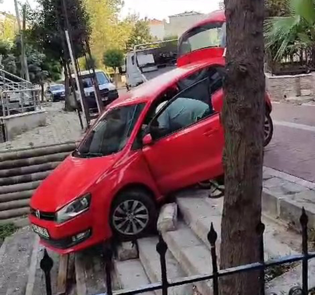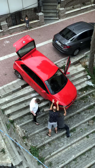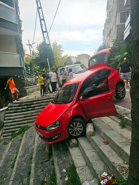 İstanbul Avcılar'da girdiği çıkmaz sokaktan manevra yaparak çıkmak isteyen sürücü, merdivenlerin bulunduğu bölümü yol zannedip aracını sürdü. Merdivenleri fark ettikten sonra frene basan sürücü aracı son anda durdurdu. Otomobil merdivenlerde asılı kalırken, sürücü aracın içinde uzun süre kurtarılmayı bekledi.