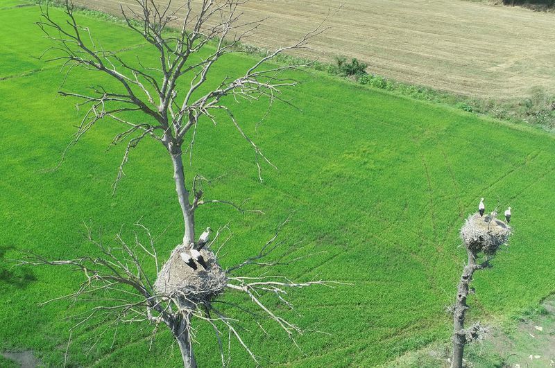 Samsun'un Bafra ilçesine bağlı Doğanca Mahallesi'nde çiftçilik yapan 2 çocuk 8 torun sahibi 67 yaşındaki İsmail Uncu'nun tarlasındaki ağaçlarda 47 leylek yuvası bulunuyor.