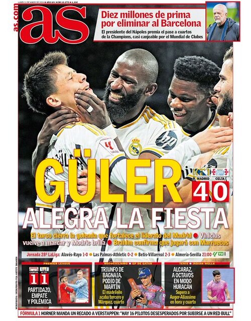 As gazetesi de "Güler, partiyi bitirdi" başlığını atarak, "Madrid taraftarı, Leipzig maçından beri takımın oyunundan memnun değil. Taraftarları son dakikalarda Arda Güler'in sadece antrenmanlarda görülen bir gol atması teselli etti." ifadesini kullandı.